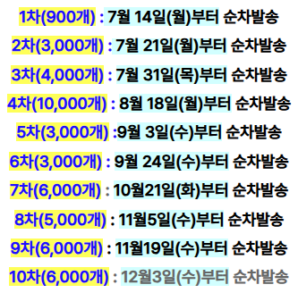 1인당 총 3개까지 구매가 가능하며 상품발송 일정 및 판매수량은 아래와 같으니 얼른 구매하시는걸 추천드려요~